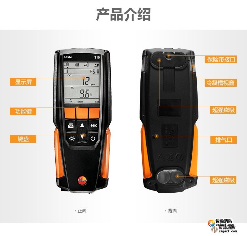 不仅如此,该手持式烟气分析仪还具有多项其它实用特性。仪器背部带有磁吸,可吸附于所有金属表面,比如燃烧器外壳,方便您腾出双手处理其他事务。传感器自动调零,仅需30秒,过滤芯更换极其简便。与此同时,testo 310轻便、坚固且耐用,防尘防撞击,内置冷凝槽可快速简便的清空。