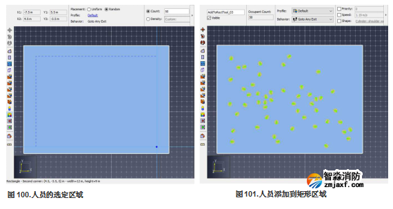 一旦属性被指定,点击-拖动来绘制填充矩形。矩形的两个点必须位于同一个房间(图100)。当你释放鼠标按钮时,人员将被安置在指定区域内(图101)。